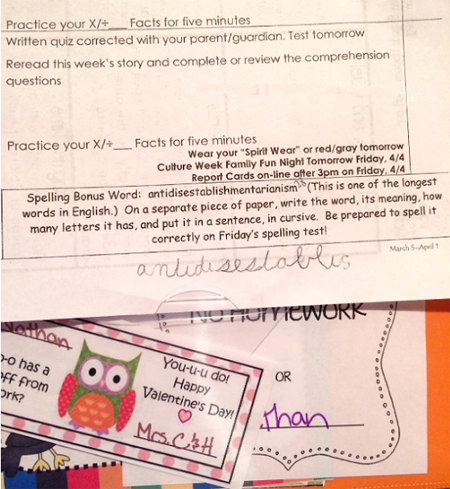 3.下面的额外作业是要求能够拼写出一个特别长的单词,antidisestablishmentarianism,一共有28个字母,是英文最长的单词之一。要求孩子们查出这个词的意思,用它造句,作业要用cursive字体来完成。